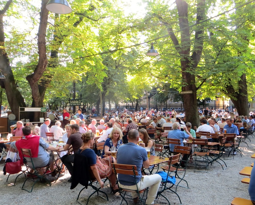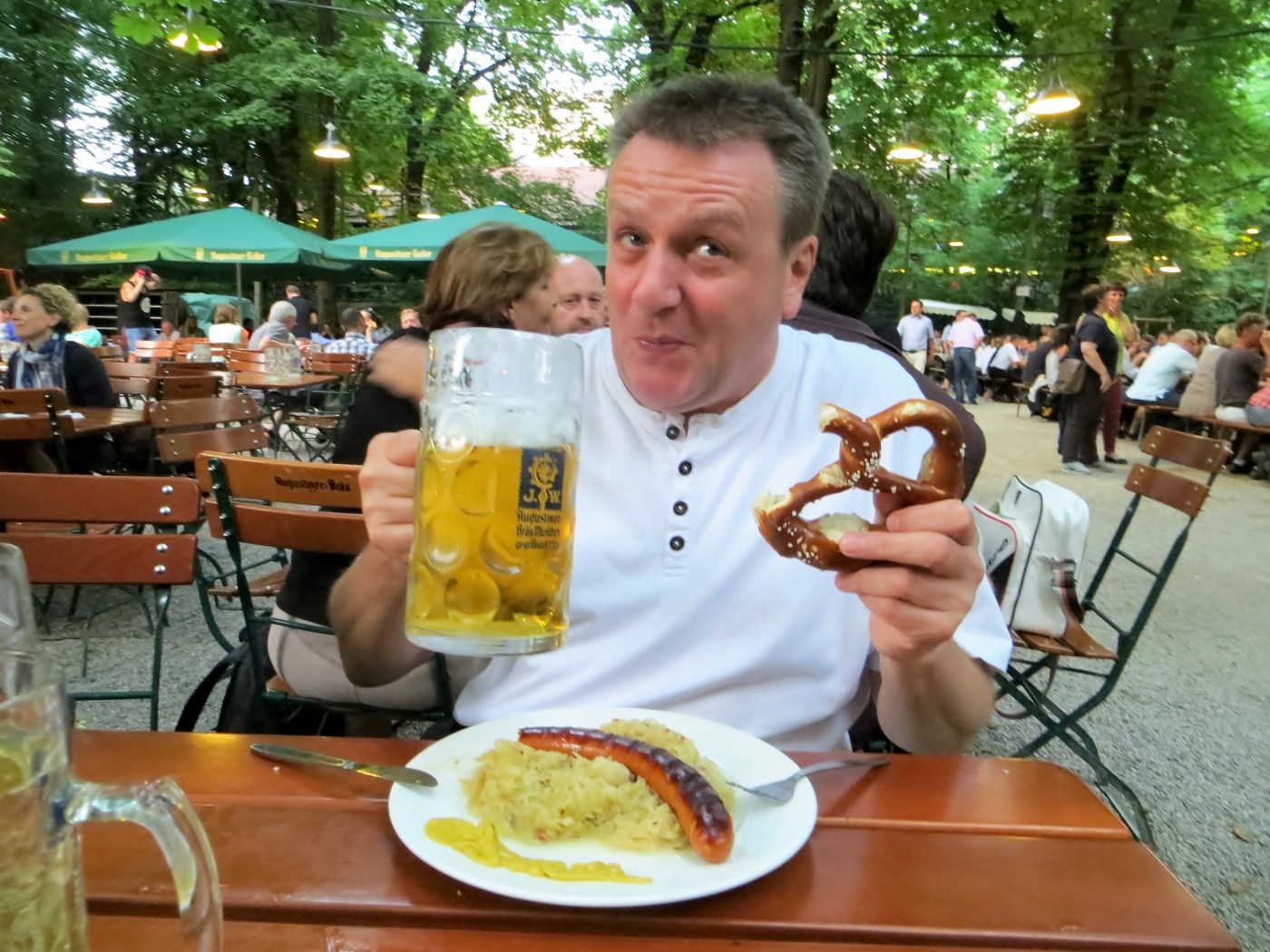 The beer garden is really a kind of adult theme park where the theme is ‘drinking’. It’s a big place with trestle tables and benches set out in the shade of trees. The area is well-appointed for families and there’s a play area for children. The beer is, inevitably, Germanically fantastic and the food is yummy if you like pork. There are lots of different types of pork, but all the meat on sale is porcine in origin. The sauerkraut was awesome, the crackling was crackly, and the big pretzels were a revelation (I’d never had them before). In fact, the place, the beer, the food, the sunshine, the company… I wanted to weep for joy. Actually, people did weep when I told them about my bathroom incident. It was some time before my wife kissed me again.