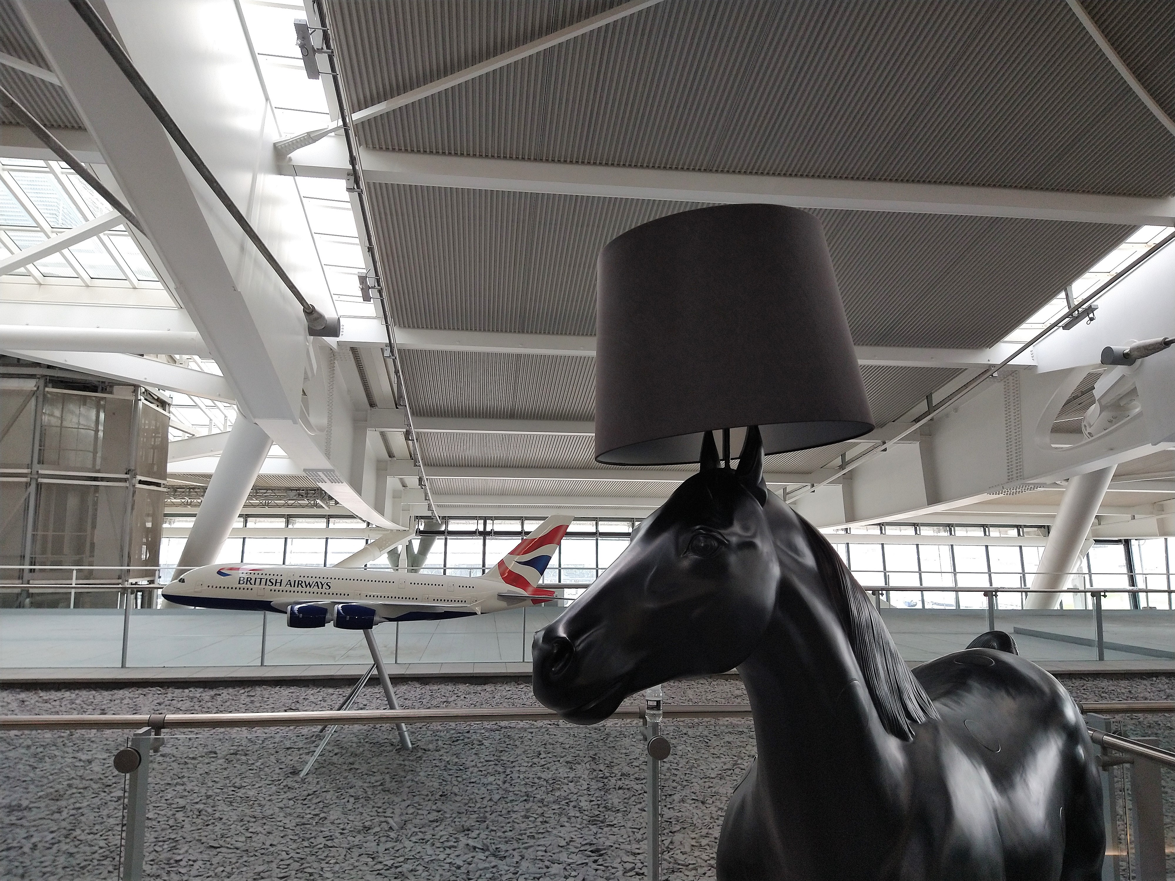 The night before we stayed at the Thistle Hotel near Heathrow, drawn by the appeal of its restaurant overlooking the runway and a free driverless shuttle pod to the terminal; very sci-fi.