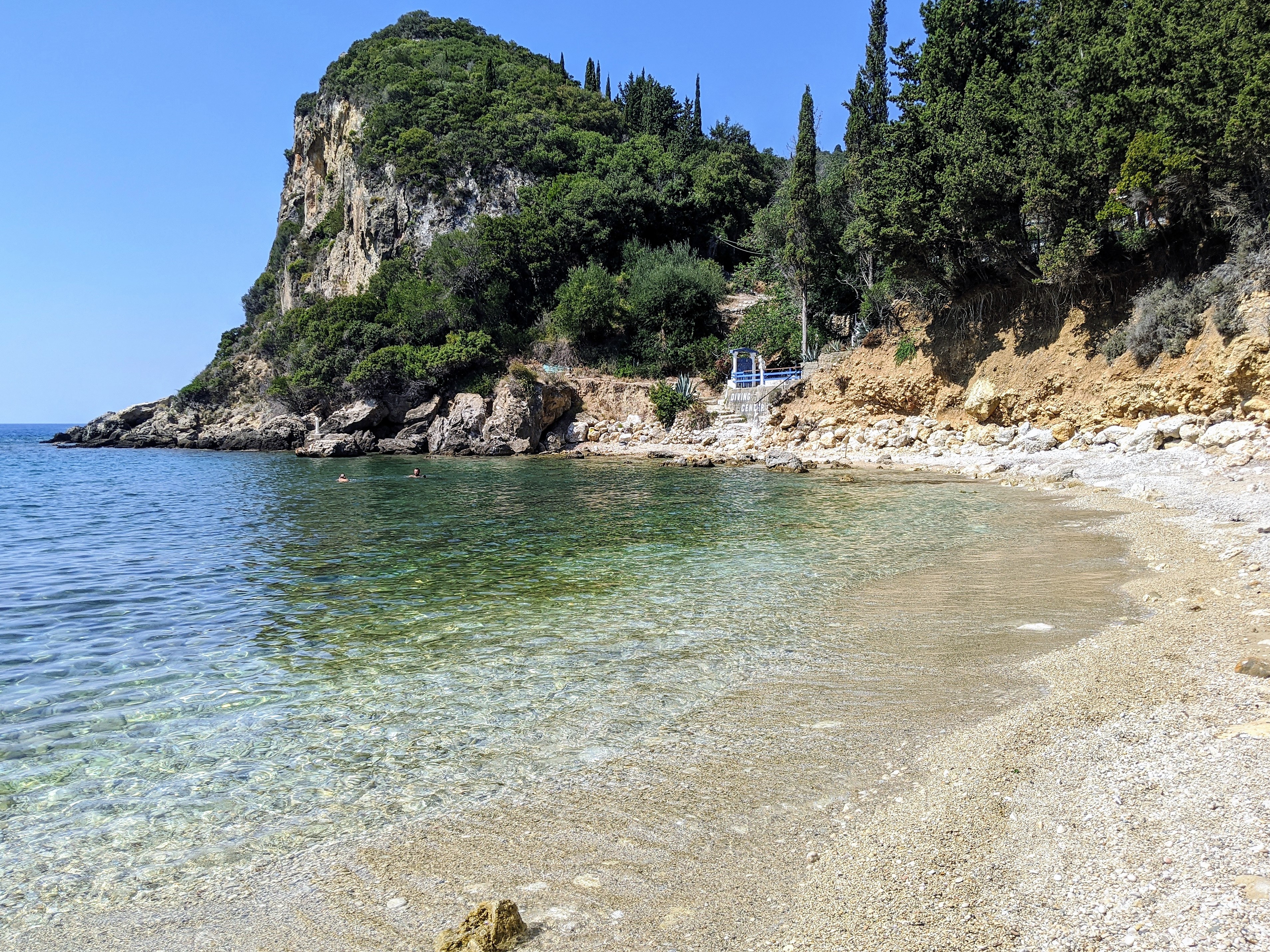 There are about five beaches in Paleokastritsa. All are of them are picturesque. Agia Triada was the nearest to our hotel and was our favourite with the Poseidon Taverna at the back. It cost €10 for two beds with sun brolly and a bottle of water. One day we went for a walk to the main beach at Agios Spiridon. It did look very picturesque but rather busy for our tastes. Just around the corner we found Ampelaki beach (a sweet little cove). It was pretty and charmingly undeveloped, apart from a handful of sunbeds. The water taxi back cost €20 and it was an agreeable little trip, bouncing gently over the sparkling wavelets. The beaches were a mixture of sand and pebbles, consequently the water was very clear. You would be wise to wear beach/reef shoes. I snorkeled a little off the beaches, but I’ve seen more interesting fish in my local chippy to be honest.