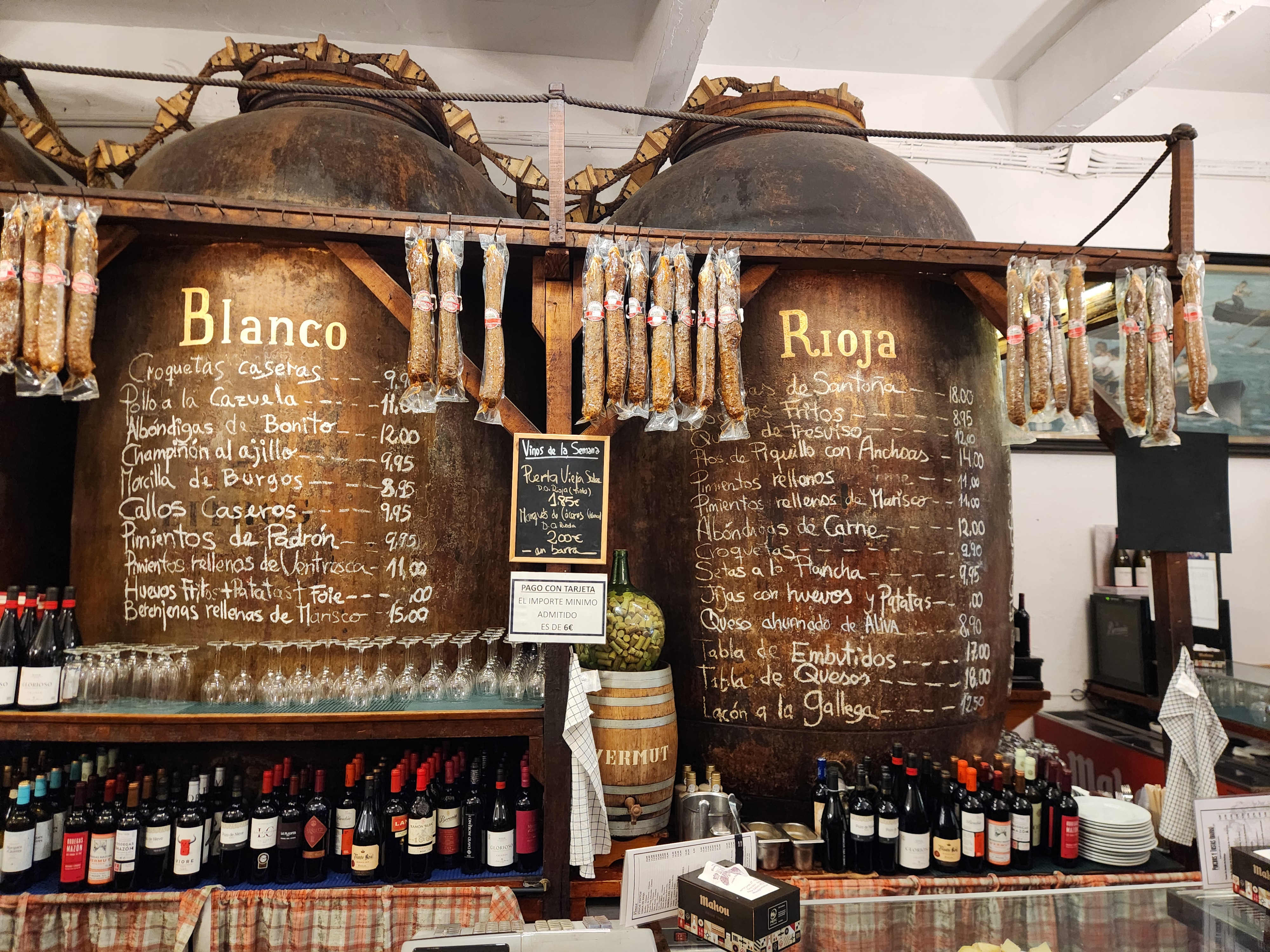 On the drink front, one bar, Bodegas Mazon, stood out. There may have been others; I don’t know. But once we’d found this place, there seemed little point in looking elsewhere. It’s a genuine, traditional Spanish boozer. Meats hanging from the ceiling, massive old barrels stacked around, bottles lined up, and free tapas snacks. It’s over a hundred years old, and it has a real historical pedigree. We loved it. Two glasses of fino sherry, two white wines; £7.50. That’s not a typo.