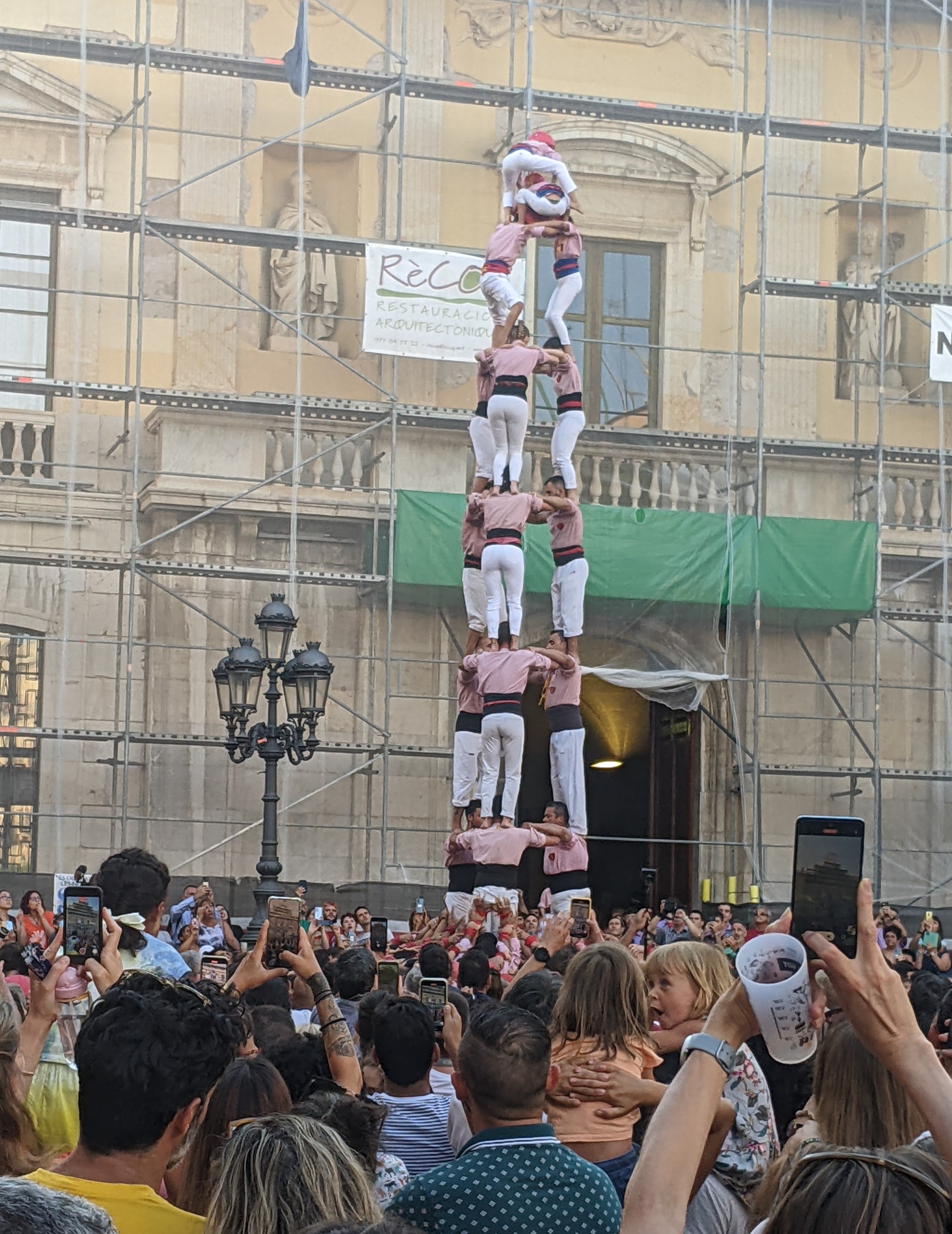One evening, walking back from an evening’s grazing, we stumbled across a large group of people gathered around a large hall. We nipped in to see what was going on. It turned out that they were teams of people practising for the ‘castelling’, which was the highlight of the Feast of Saint Joan (I think) festivities. They let us in to watch the practise and we got a real close-up view from a balcony inside the building. I could have reached out, tickled one and dropped the tower. I didn’t.