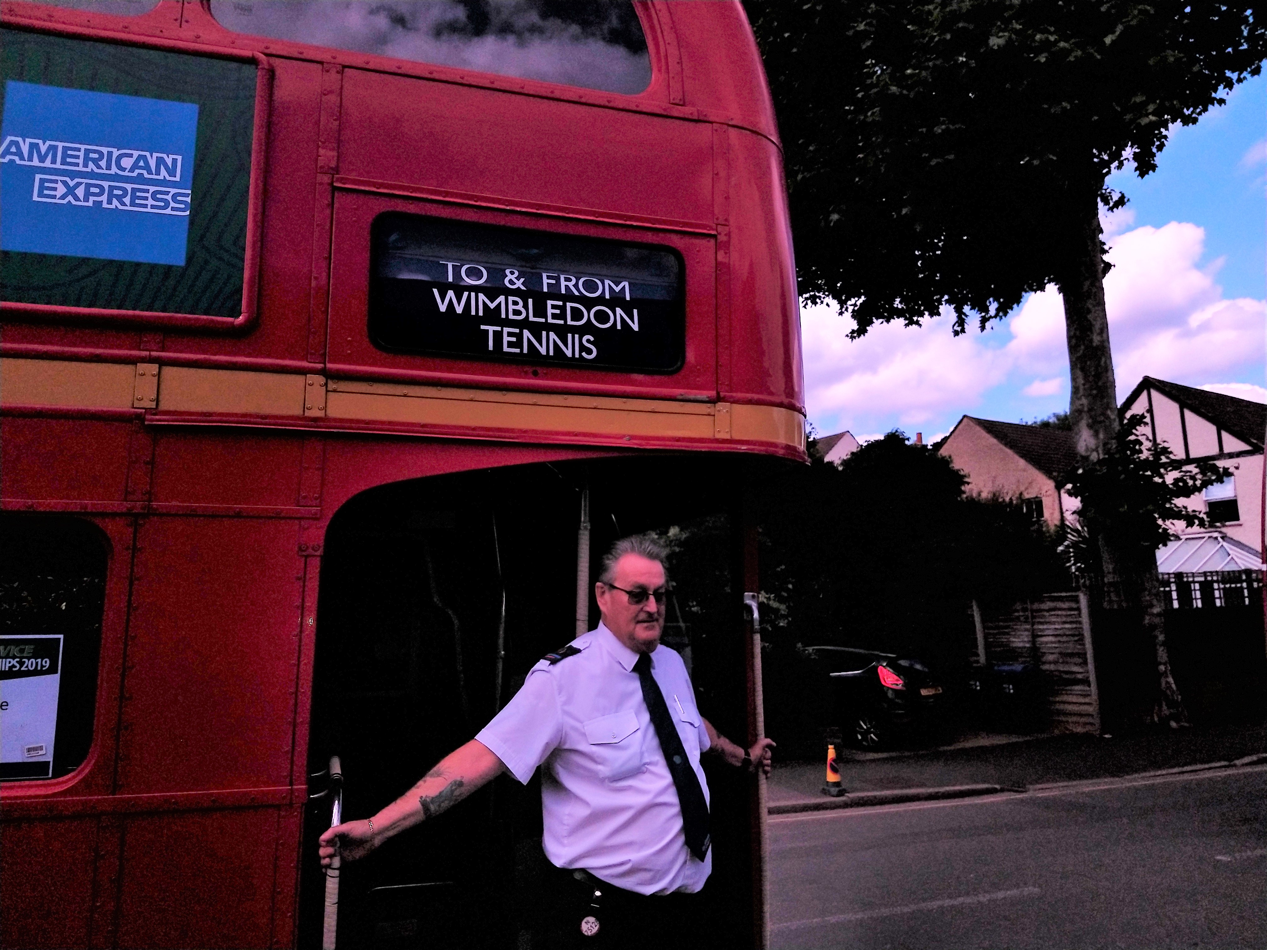 Next morning, our route to the tennis was somewhat circuitous as the District line was closed and it’s the only tube that serves Wimbledon. It’s worthwhile remembering that about 60 000 other people are making their way there. Although we thought we had plenty of time, the delays caused us to miss the first match. Outside the railway station, we queued up to catch a bus to the All England Tennis Club. We were put on one of the classic old routemasters and went straight upstairs to prove we were hard. I wanted to smoke a cigarette to underline the point. The driver’s name was Reg Varney and his mate, Stan, was the conductor who gave us a jocular guided tour of Wimbledon on the way.